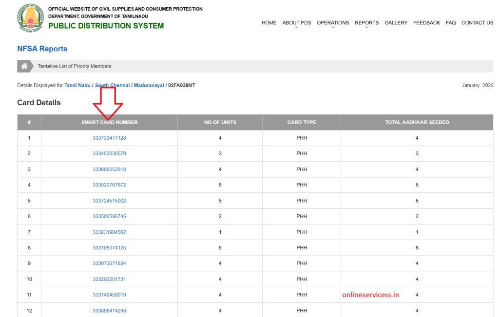 First go to the official website of Tamil Nadu Ration card TNPDS. and click on Smart Card Application status under menu smart card application services, this show in below image